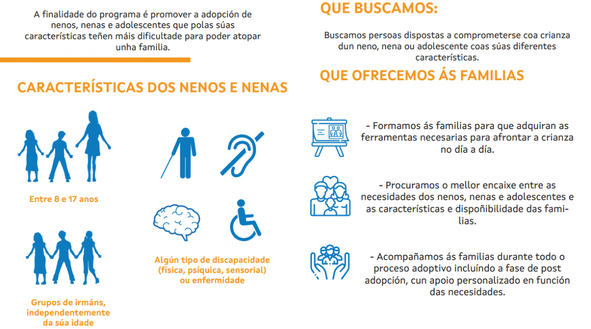 El programa se desarrolla en colaboración con la Fundación Meniños. Los/las técnicos/as del programa buscan, seleccionan y forman a familias dispuestas a adoptar NNA con alguna de estas características. Una vez que se encuentra una familia idónea para un NNA o grupo de hermanos que puedan tener dificultades de integración, los/las técnicos/as llevan a cabo un acompañamiento constante durante todo el proceso, desde la fase de acogimiento preadoptivo hasta dos años desde el inicio de la convivencia.