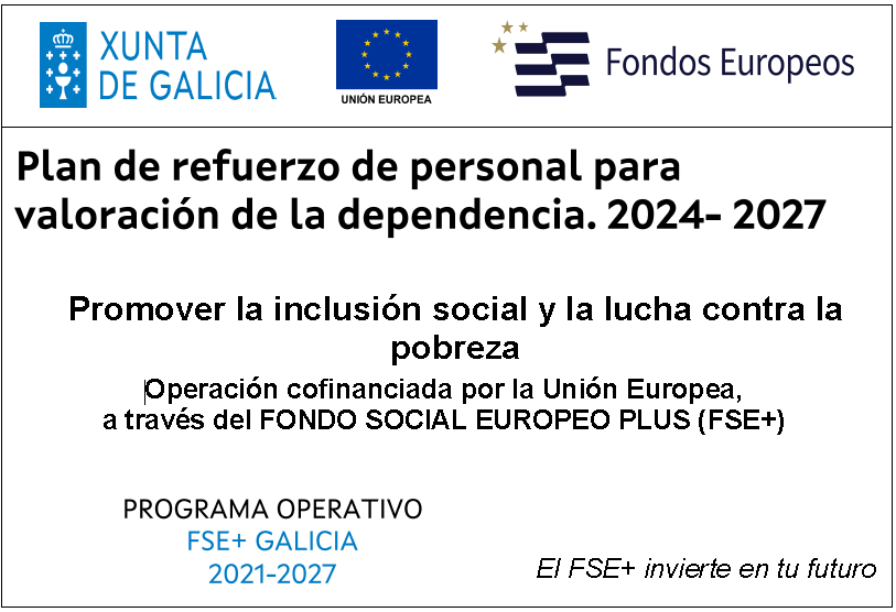 Es un plan cofinanciado a través del Fondo Social Europeo Plus (FSE+), en el marco del Programa Operativo “FSE+ GALICIA 2021-2027”, que tiene como objetivo específico 4.11. "mejorar la igualdad y la oportunidad del acceso a unos servicios de calidad, sostenibles y asequibles, incluidos los servicios que propicien el acceso a la vivienda y unos cuidados centrados en las personas, especialmente la sanidad; modernizar los sistemas de protección social, especialmente el fomento del acceso a la protección social, con una atención particular a los niños y los colectivos desfavorecidos; mejorar la accesibilidad, también para personas con discapacidad, la efectividad y la resiliencia de los sistemas de asistencia sanitaria y de dependencia".