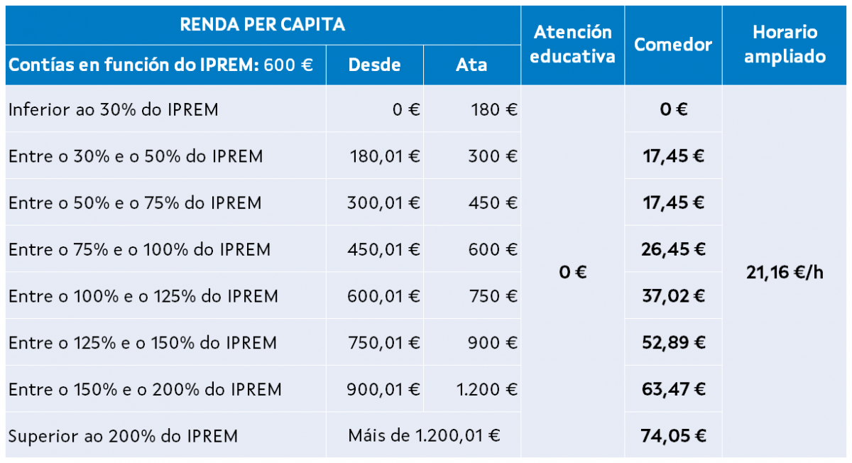 A Xunta financia o 100% da atención educativa. As familias que desexen servizos complementarios, como comedor ou horario ampliado, aboarán en función da súa renda:   Aplicaranse os seguintes descontos: